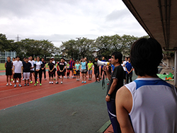タイムトライアルは、400mのトラックを7周半ランニングするもの。タイムを気にしながらの真剣走り、仲間と話しながらのファンラン、コツコツと自分ペースをきざむマイペースランナーなどさまざま。雨あがりの青空がのぞくなか、皆、それぞれに気持ちのよい汗を流しました。私(上北)は、ちょうど中間ぐらいの速さ(キロ5分半)の集団の伴走をつとめましたが、おしゃべりしながら、ときに質問に答えながら、楽しく走りました。
