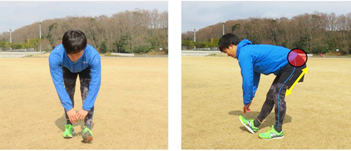 ポイント:膝を真っ直ぐに伸ばして前屈します。体が丸まらないように骨盤から上体を倒すように心がけましょう。