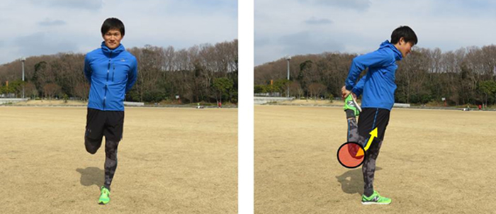 ポイント:体の後ろでつま先を持ちます。膝が上体より前に出ないように気を付けましょう。