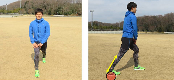 ポイント:脚を後ろに引き、地面から踵が浮かないように体重を前にかけていきます。