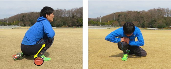 ポイント:片膝を立てて地面から踵が浮かないように、体重を前方にかけます。