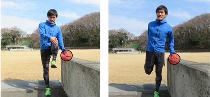 後半、足が疲れてフラフラしてしまうので、片足立ちになるストレッチは無理せず電柱、ガードレールなどを支えに行いましょう。