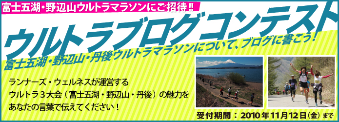 | 選考と発表 | 応募いただいた方の中から、4名の方に2011年度開催の富士五湖・野辺山ウルトラマラソンにご招待致します。選考は、ウルトラブログコンテスト実行委員会が行います。