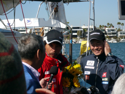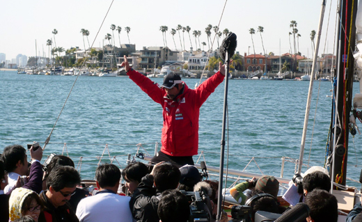 70日間におよぶ太平洋横断航海を終えたエオラス号は、寛平夫人光代さん、比企夫人はじめ多くの報道陣やアースマラソンスタッフが今や遅しと待ち構える中、アラミトスマリーナにゆっくりと入港してきた。エオラス船上で大きく両手を振る寛平さん、およそ70日ぶりに味わう地上の感触と懐かしい顔。対面での感激のおおきさが航海と横断の大変さを物語っている。髭も頭の髪の毛も伸び放題だが、元気いっぱい。