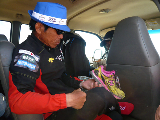 Morango Valleyを越えた23キロ地点で昼食の支度をしていたら、妙齢の美女二人が応援にきてくれた。味噌汁と炊き込みご飯持参で。ありがたい!というのは、このところ炊事係になっている私なのだが、現地で買い求めたガスバーナーに祟られているようで、毎回のようにガスの出が悪かったり、出なかったりで満足に火が使えない。今日も取り替えたばかりのバーナーの火が出ず、せっかく準備していた炒め物が用意できないでいた。取り敢えず、今朝炊いた金芽米のご飯でおかゆを作り、玉子をほぐしたほうれん草ソテーを助っ人と一緒に作り、なんとか寛平さんの到着に間に合うことができた。聞けば、彼女たちは16日に泊まったエリアに住んでいる方で、四日間も捜し回ってようやく突き止めた、とのこと。寛平さんが喜んだのはいうまでもない。そして、なんと一人の方はあのV6の井ノ原くんの実姉だった。これにはスタッフ共々ビックリ!!今から12年前、井ノ原くんとは24時間テレビで一緒に仕事をしたことがあったので、懐かしい気持ちでお礼を伝えた。