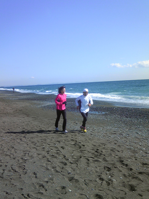 冬晴れの湘南大磯の海岸で谷川真理さんと波打ち際をジョグ。相模湾の海は素晴らしい湘南ブルーと真っ白な波頭のコントラストを描き出していて、気分はサイコー!江ノ島のグリーンも箱根の山並みも雪を頂いた富士も一望にできる湘南ってホントにいい所だとつくづく思う。市民ランナーから生まれ、トップランナーに上り詰めた真理ちゃんと会うのはホントに久しぶり。現役をひいたあとも相変わらず爽やかさとランナーとして今の自分を更に上のステージを目指そうとしている意欲的な彼女は素晴らしいと思った。今は故障を抱えて七転八倒している小生だけど、また機会があれば一緒にジョギングしてみたいと思う。