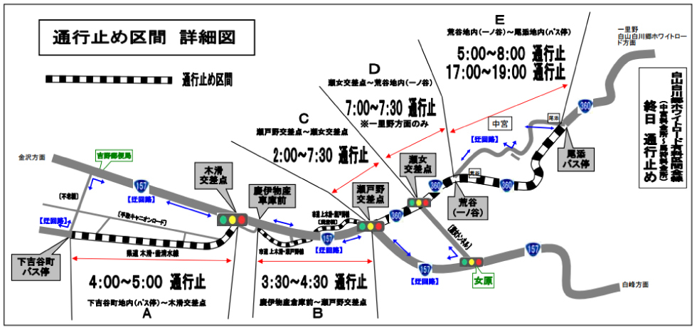 9月11日(日)白山白川郷ウルトラマラソン開催に伴い、下記の区間を交通規制させていただきます。 特に、50㎞の部参加の方で自家用車でご来場されますランナーの方は、下記交通規制図および 会場周辺に配置される誘導員の指示に従って、ご来場ください。 なお、「白山白川郷ホワイトロード」は終日通行止めとさせていただきます。皆様のご協力お願いいたします。