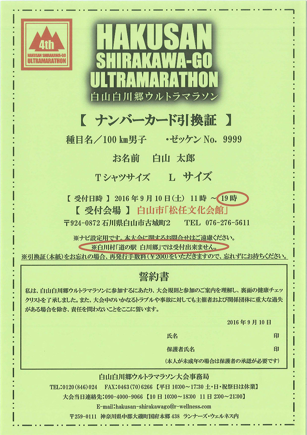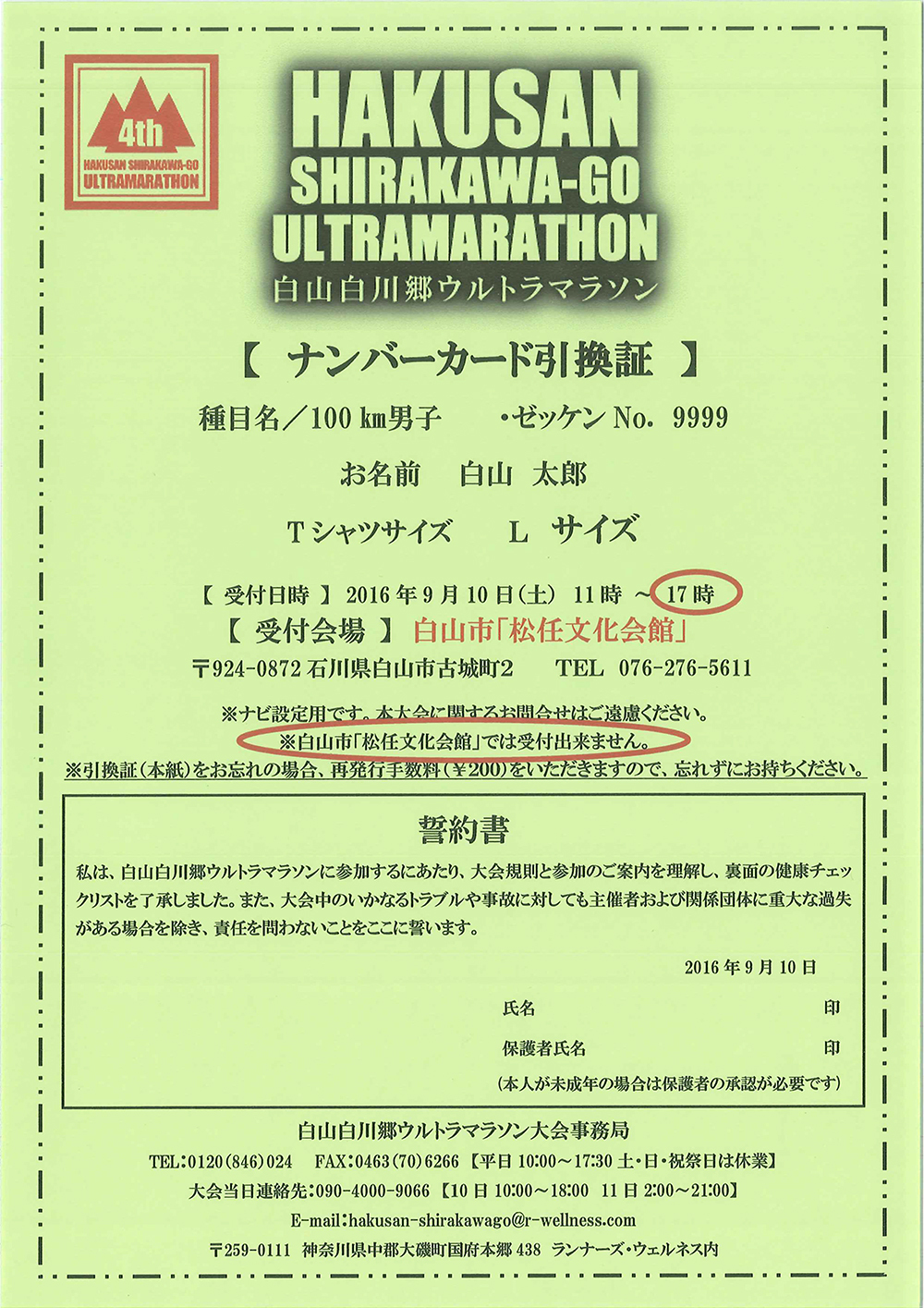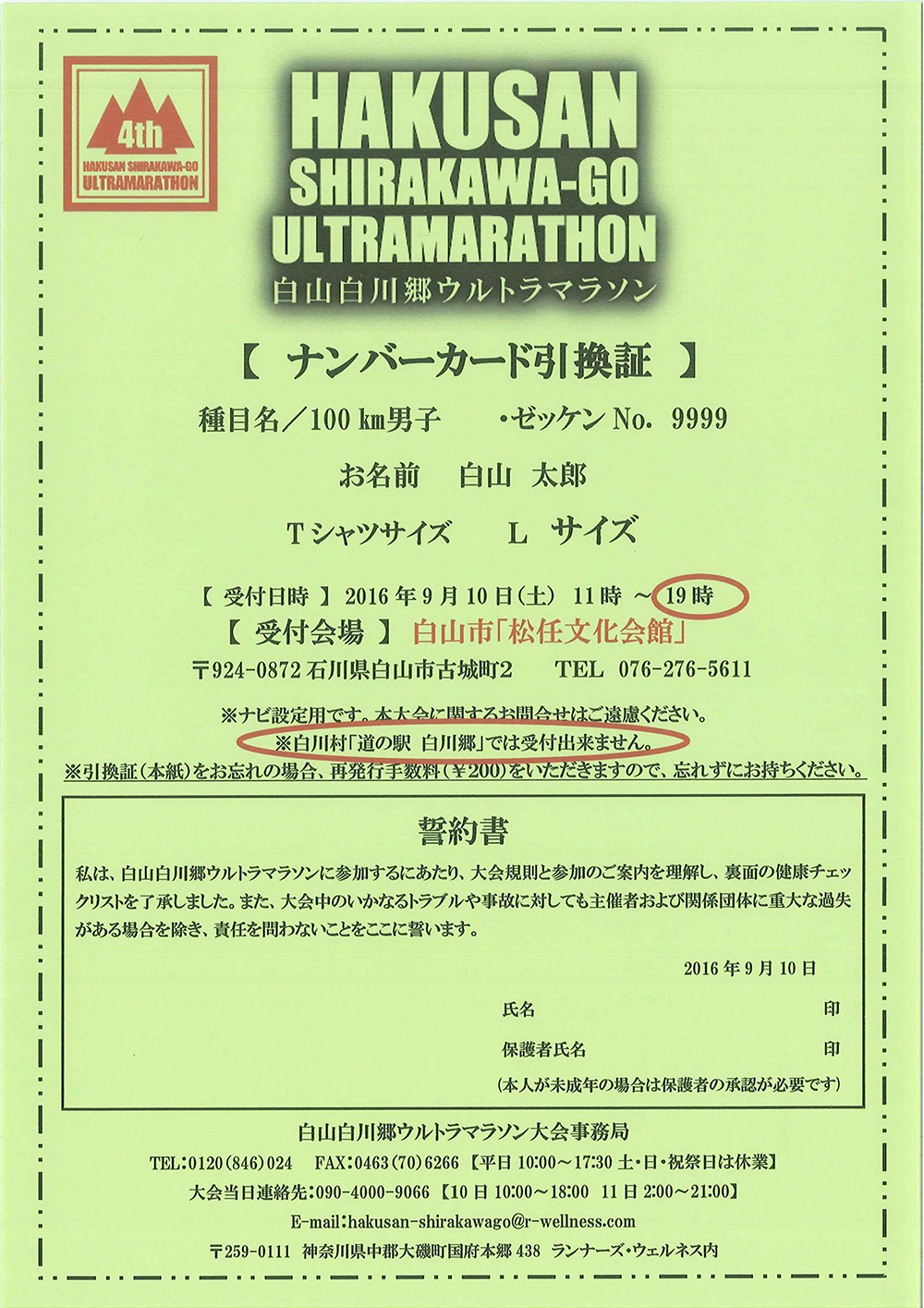 緑色のナンバーカード引換証をお持ちの方は、大会前日白山市「松任文化会館」受付会場にて引換証をそのままお出しください。