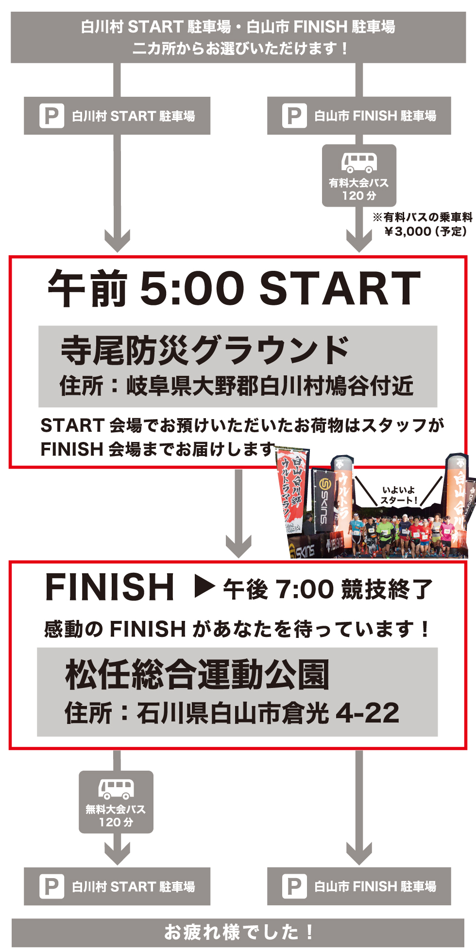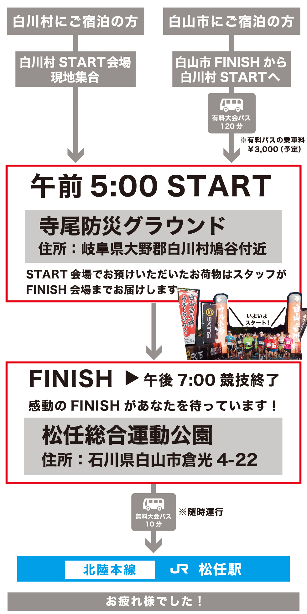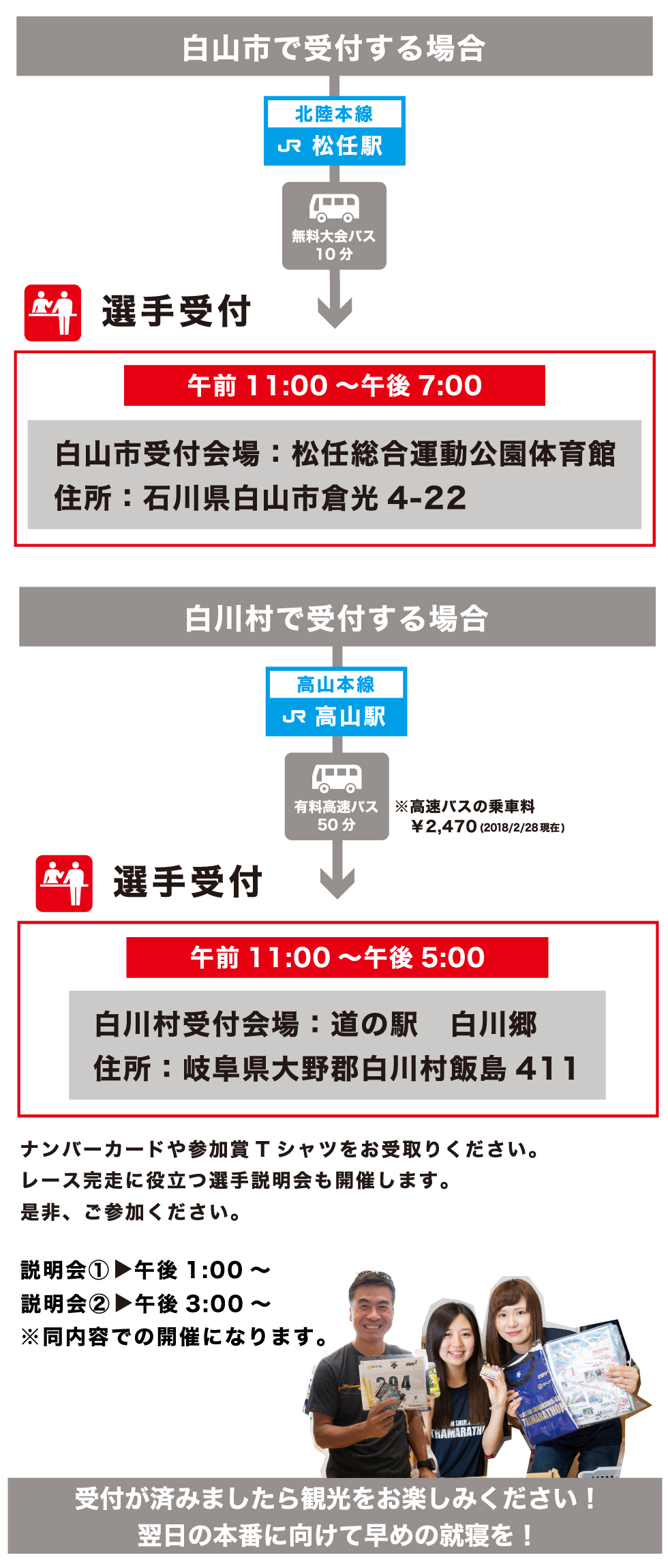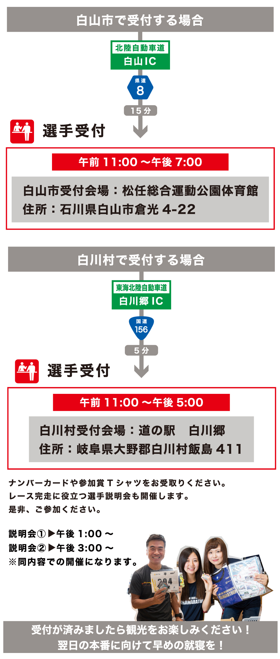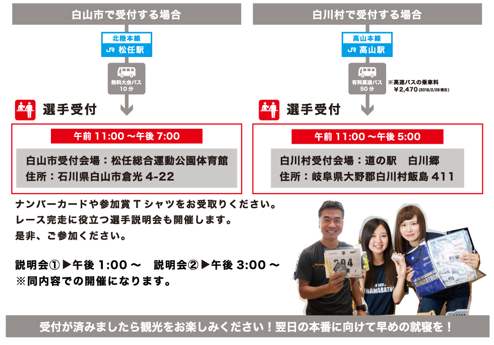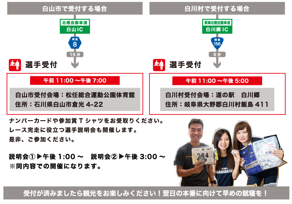 宿泊地に合わせて白山市・白川村の二か所から受付会場を選べます!