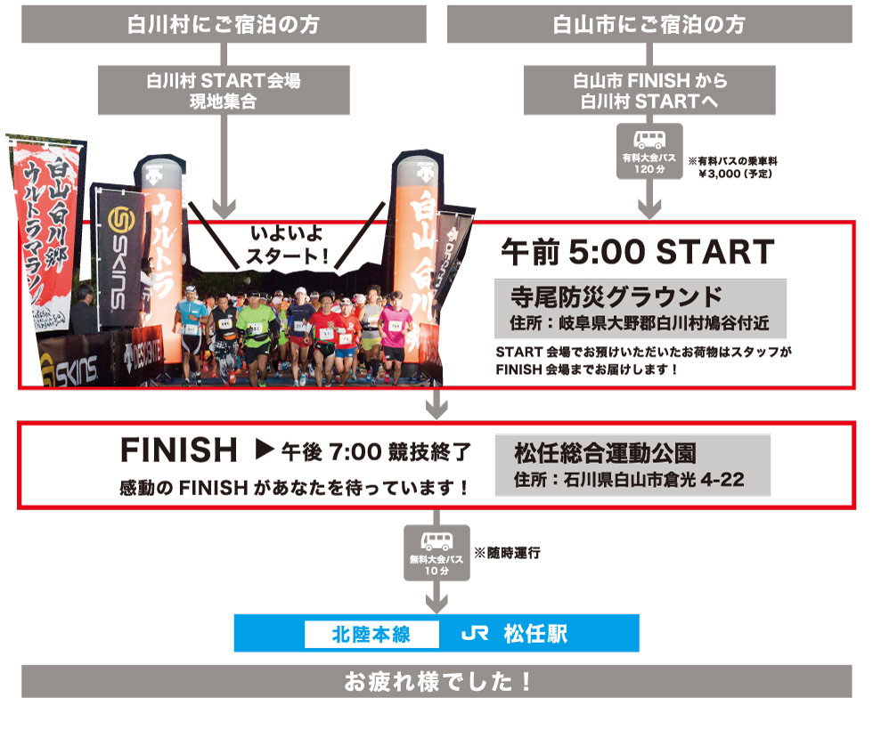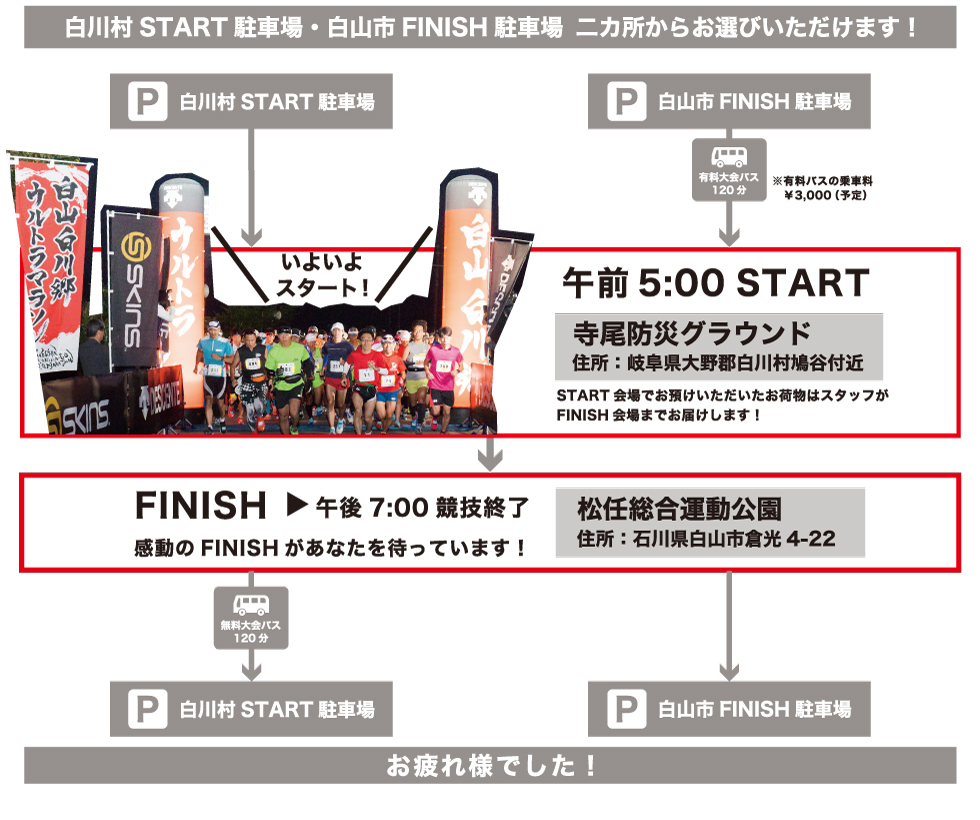 お申込みの際、前日受付会場を選択することができます。石川県白山市の『松任総合運動公園体育館』、もしくは岐阜県白川村側の『道の駅 白川郷』です。