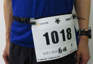 ナンバーカードをつけるベルトです。途中で着替えをするウルトラマラソンでは、ナンバーカードをワンタッチで着脱できるので便利です。