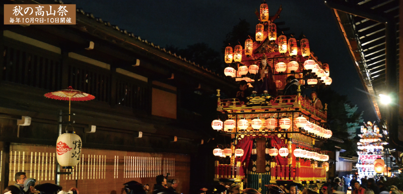 高山祭とは春の山王祭と秋の八幡祭の総称で、日本三大美祭の一つに数えられています。動く陽明門とも称される絢爛豪華な祭屋台が春と秋合わせて23台登場するほか、巧みな人形の動きを披露するからくり奉納や祭行列など、伝統的な祭行事が飛騨高山を彩ります。