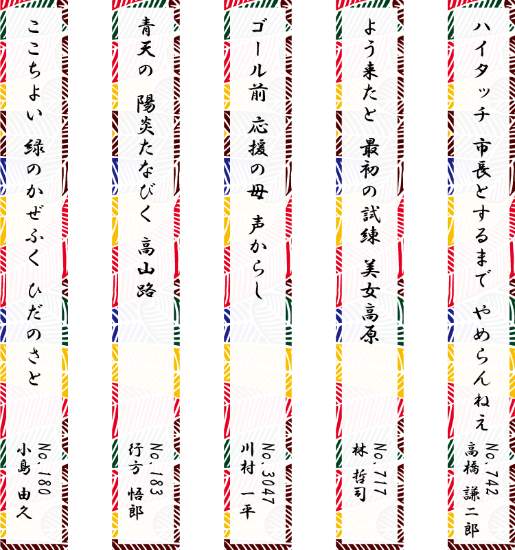 ウルトラ川柳 沢山の投稿をいただきましたウルトラ川柳の特賞作品を選出いたしました。特選に選ばれた5名にはレースプロデューサー坂本雄次直筆の色紙に仕立て、記念品としてお送りします。おめでとうございます! 協賛 応援
