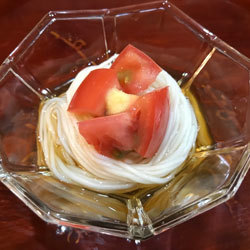 ツユの塩分がトマトの甘さを引き立て、素材そのものの味が生かされています。疲れた身体に塩分とエネルギーを補給するにはもってこいの一品!!