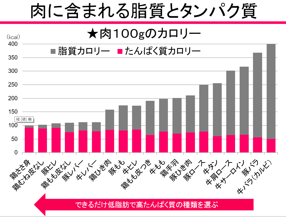 また、脂質の多いものはたんぱく質が少なく、高カロリーです。特に肉は種類によって大幅に違うので、ランナーはできるだけグラフの左側の種類を選んで食べましょう。