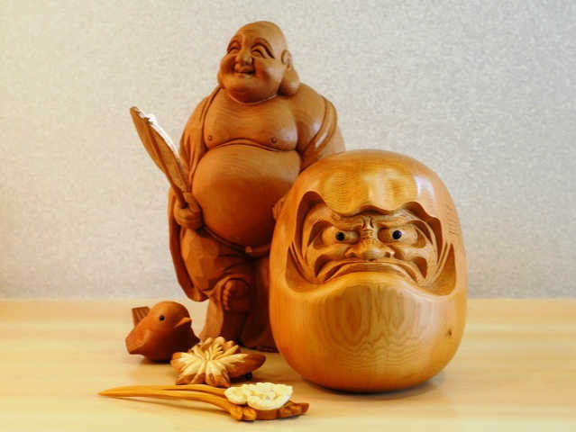 一切の彩色をせず、木そのものを活かして彫られるため、年月が経つにつれて木肌や木目の色艶が深くなっていくことが特徴です。