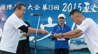 丹後ウルトラマラソンは、第15回大会より国際親善大会として生まれ変わり、台湾の南横超級マラソンと友好提携を結びました。上位入賞者2名を相互に派遣しあい、友好を深めます。2015年大会では、南横超級マラソンレースディレクターの傅祺育(フーチーユー)さんの来日をはじめ台湾から17名、その他10カ国34名が、丹後ウルトラマラソンに参加しました。