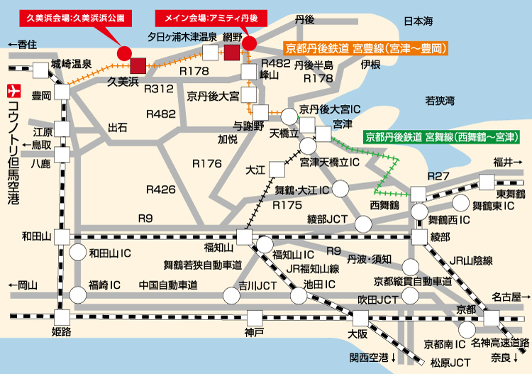 ▶京都丹後鉄道の網野駅より受付会場のアミティ丹後(約2㎞)までシャトルバスを運行します。