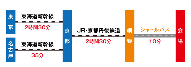 - 舞鶴若狭自動車道から京都縦貫自動車道京丹後大宮I.C.より約18km(約30分)