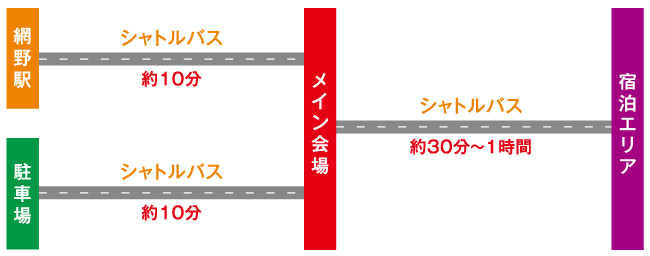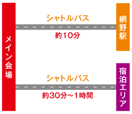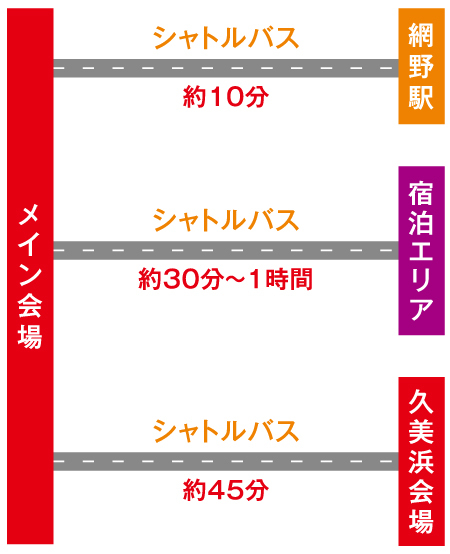 ▶京都丹後鉄道の網野駅よりメイン会場のアミティ丹後(約2㎞)までシャトルバスを運行します。