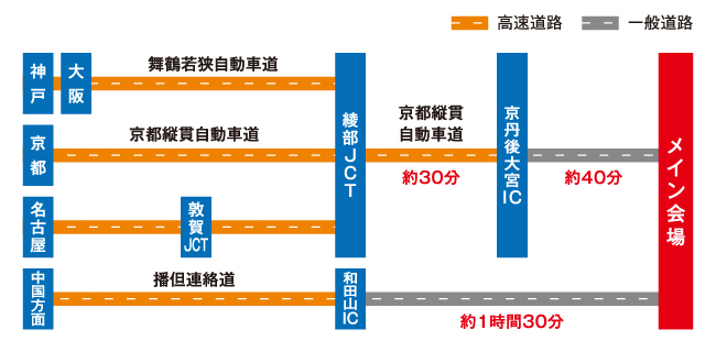 1. 舞鶴若狭自動車道から京都縦貫自動車道京丹後大宮I.C.より約18km(約30分)