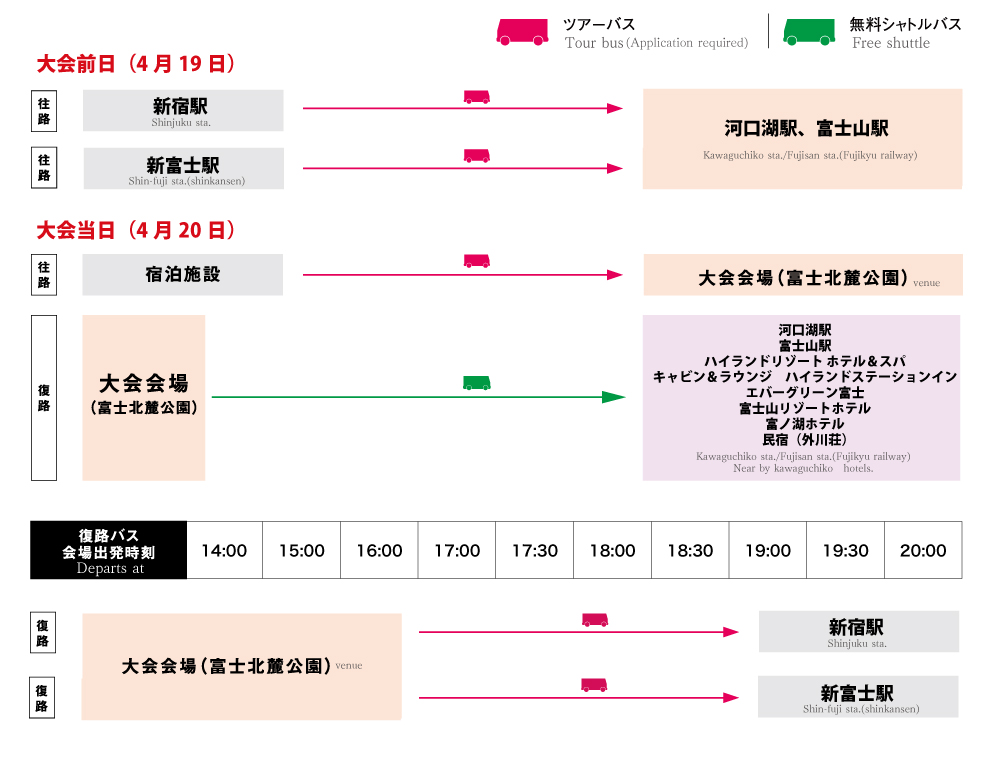 赤色のツアーバスご利用には、富士急トラベル(株)へ事前のお申し込みが必要です。