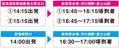 ※到着場所の前夜祭会場、河口湖駅、富士山駅への到着は、状況により前後する事があります。