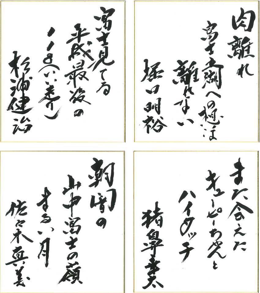 HOME | お知らせ | ウルトラ川柳特選を発表します ウルトラ川柳特選を発表します 2019.6.11 沢山の投稿をいただきました第29回チャレンジ富士五湖ウルトラ川柳の特選作品を選出いたしました。これら四句を、大会プロデューサー坂本雄次直筆の川柳色紙に仕立てて、記念品とともにお送りしました。 応援