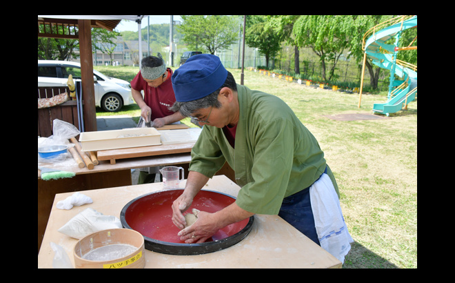地元でとれた、ぶどうなどのフルーツをご提供する給水所があり、またゴール会場では地元名産の「信州そば」を振る舞っています。