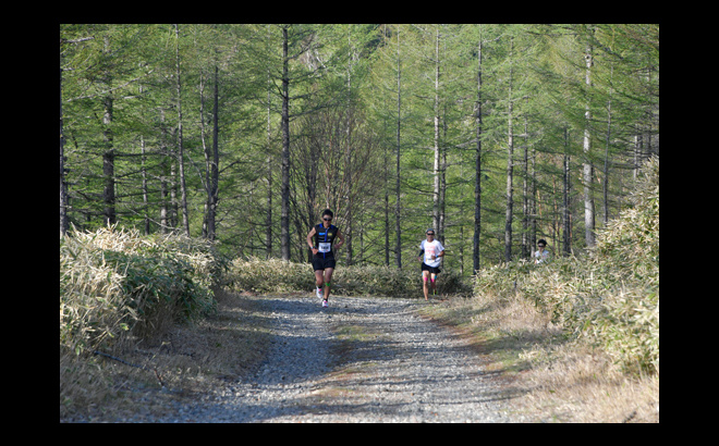 スタートしてから10kmほど進むと林道コースに入ります。長さにして約15km、未舗装の砂利道を走るトレイルコースは一気に心拍数を上げること間違いなしです。序盤戦はトレイルシューズがオススメ!!42㎞地点の着替えポイントでランニングシューズに履き替え気分一新走り出しましょう。