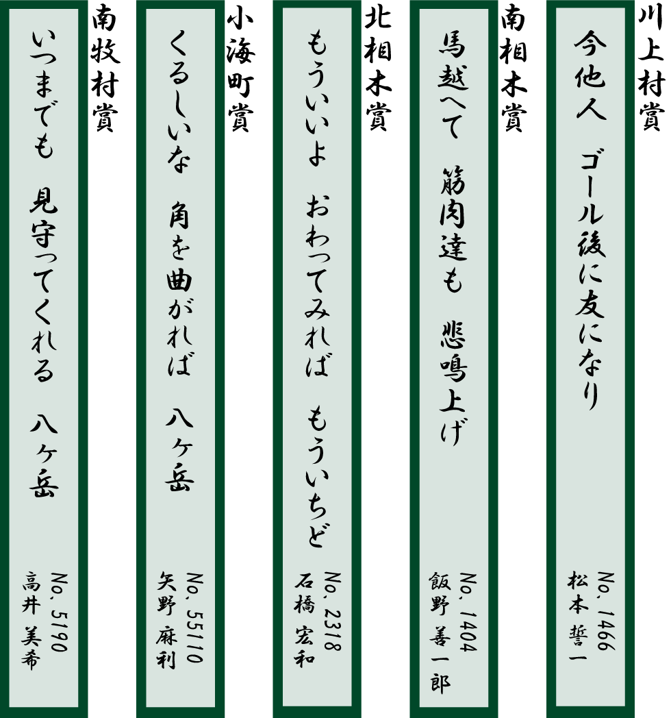第24回星の郷八ヶ岳野辺山高原100kmウルトラマラソンウルトラ川柳 特賞を発表します。 2018.8.20 ご案内が遅くなりましたが、第24回大会のウルトラ川柳の特賞作品を選出いたしました。 特賞に選ばれた5名には大会開催5町村の自治体よりそれぞれ記念品をお送りします。おめでとうございます! 協賛 応援