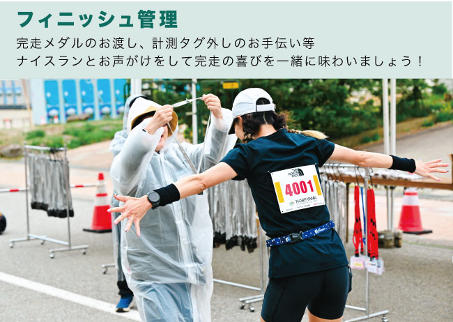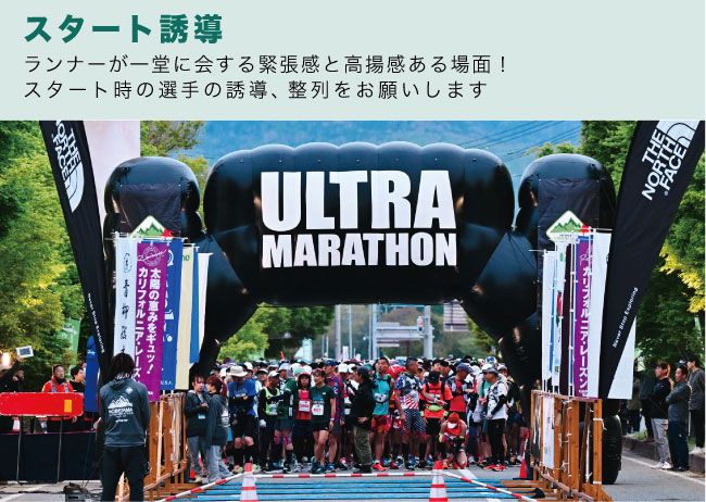 大会会場およびコース上で、ランナーの安全と大会運営を支えるさまざまな業務を担当していただきます。