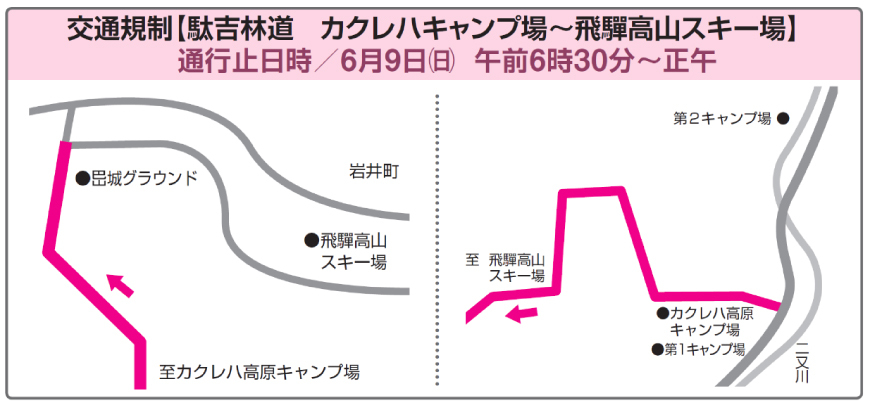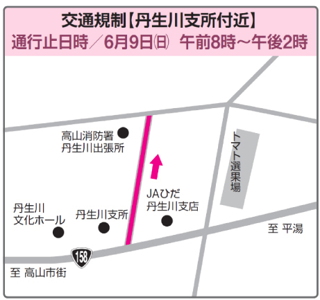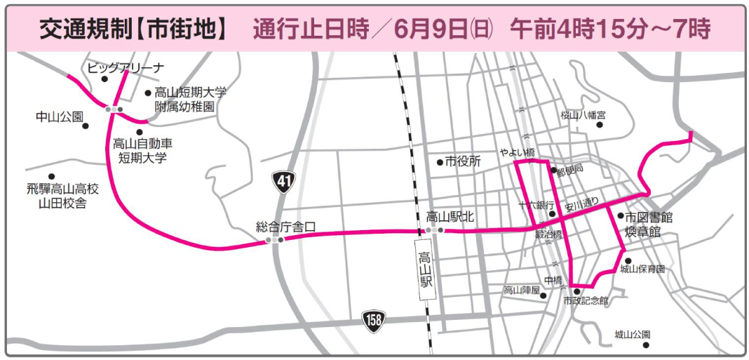 HOME | 大会情報 | 交通規制 交通規制 第8回飛騨高山ウルトラマラソン実施による交通規制にご協力ください 選手はコースの歩道部分もしくは白線の内側を走りますが、次の地点については車道部分を走りますので、それぞれの時間帯は全面通行止めとします。 ご理解とご協力をお願いします。 ※すべてのランナー通過後、順次規制を解除します。 交通規制に関する問い合わせ先 飛騨高山ウルトラマラソン実行委員会(高山市観光課内)電話:0577-35-3145 協賛 応援