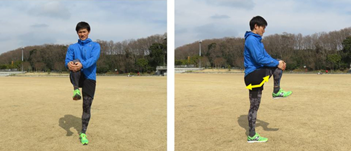 ポイント:体の後ろでつま先を持ちます。膝が上体より前に出ないように気を付けましょう。