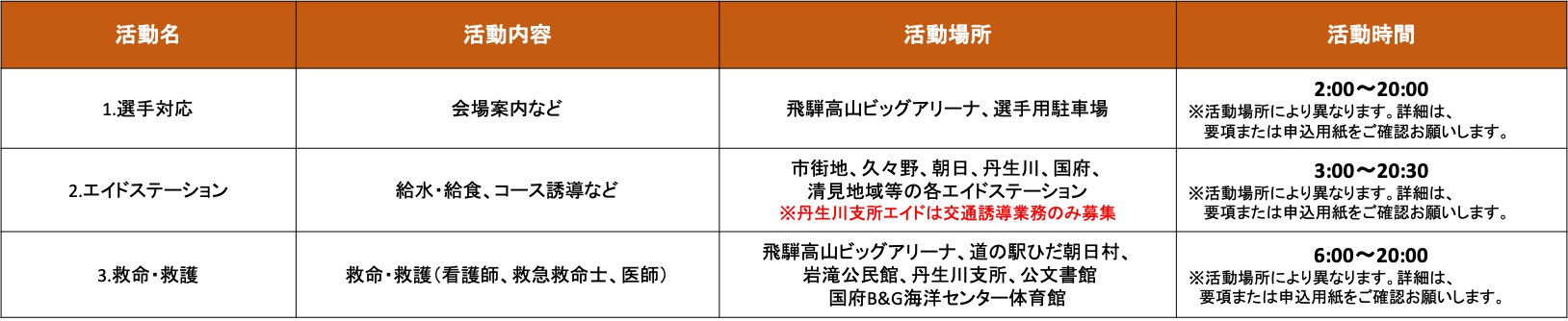 - ・自然災害や悪天候、公共交通機関の麻痺等の不測かつ突発的な事由により、大会が中止となる場合がございます。大会が中止となった場合、ボランティア活動はありません。