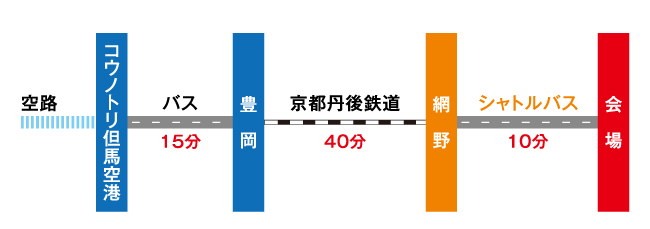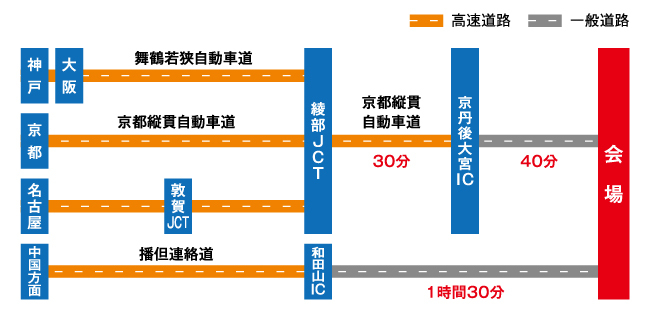 - 舞鶴若狭自動車道から京都縦貫自動車道京丹後大宮I.C.より約18km(約30分)