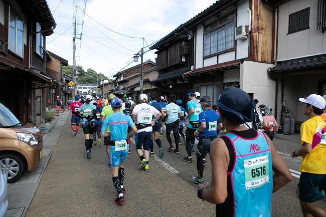 60kmのスタートでは整列前の準備運動が恒例。さわやかな空気の中、みんなで準備運動をしてからスタート整列をするのは丹後ウルトラ60kmの部の特徴です。スタートしてすぐ、印象的な古い町並みを走り抜けます。