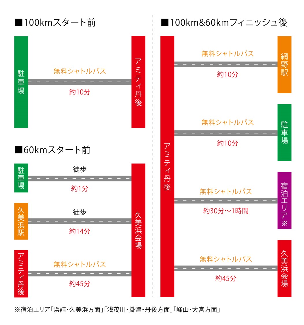 ・60kmの方も100km駐車場に駐車が可能です。100km駐車場に駐車した場合は、100kmスタート会場からシャトルバスで60kmスタート会場に行くことが出来ます。