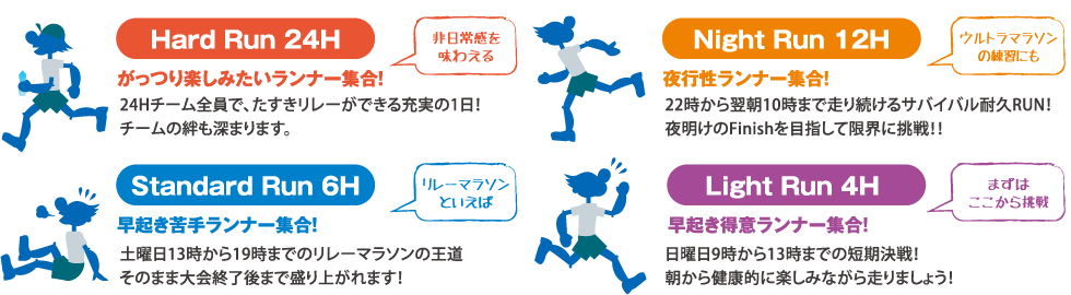 | 12時間 | チームの部 | 7,500円×(4~8名) | 50チーム (4~8名) |