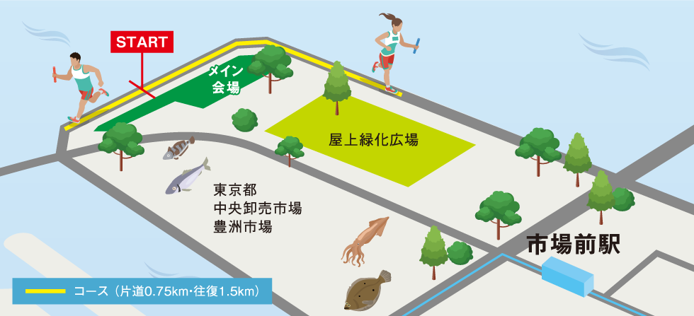 コース 豊洲ぐるり公園内の豊洲ぐるりジョギングコース(全長4.8km)の一部を利用した特設コースになります。 特設コース:片道約0.75km、往復1.5kmのコースです。 ※コースは予告なく変更する場合があります。